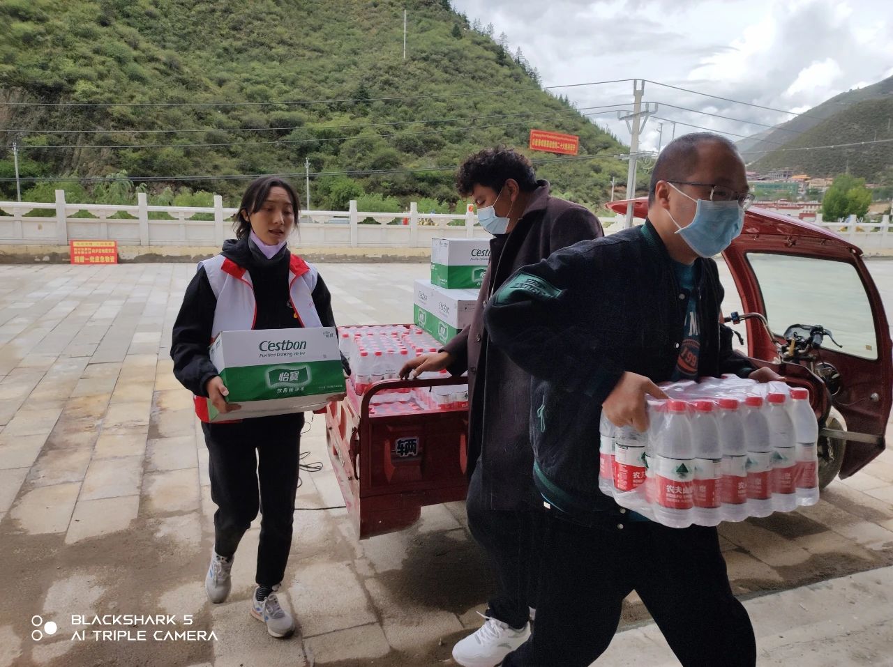 我司員工與白玉縣紅十字會工作人員搬運物資中