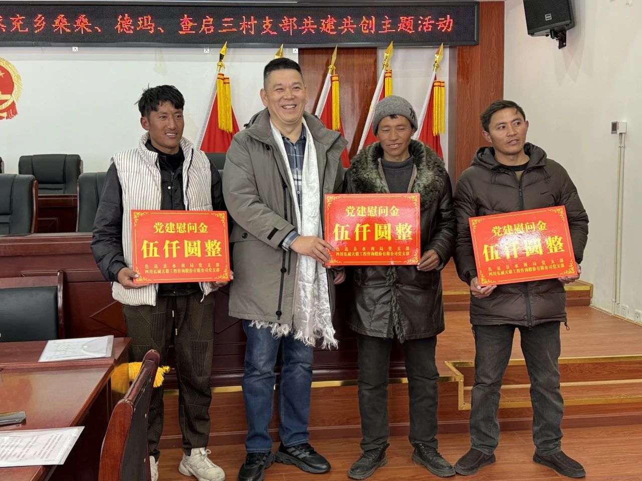 會后,弘誠天毅黨支部向桑桑、德瑪、查啟三村黨支部捐贈慰問金各5000.00元,共計15000.00元。